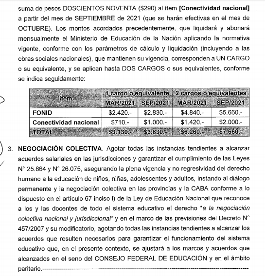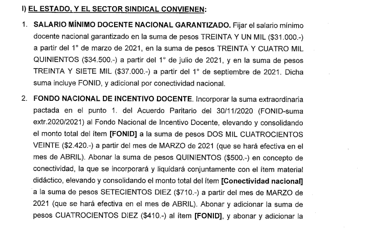 El Ministro de Educación Nicolás Trotta y los gremios docentes nacionales alcanzaron un punto en común con el gobierno respecto al aumento salarial de 2021. Los docentes del país tendrán un incremento del salario inicial del total de 34,55%. Se pagará en tres cuotas durante el transcurso del año, en marzo, julio y septiembre. Y el acuerdo tendrá vigencia hasta noviembre, cuando se convocará a una nueva paritaria para trabajar en la renegociación.