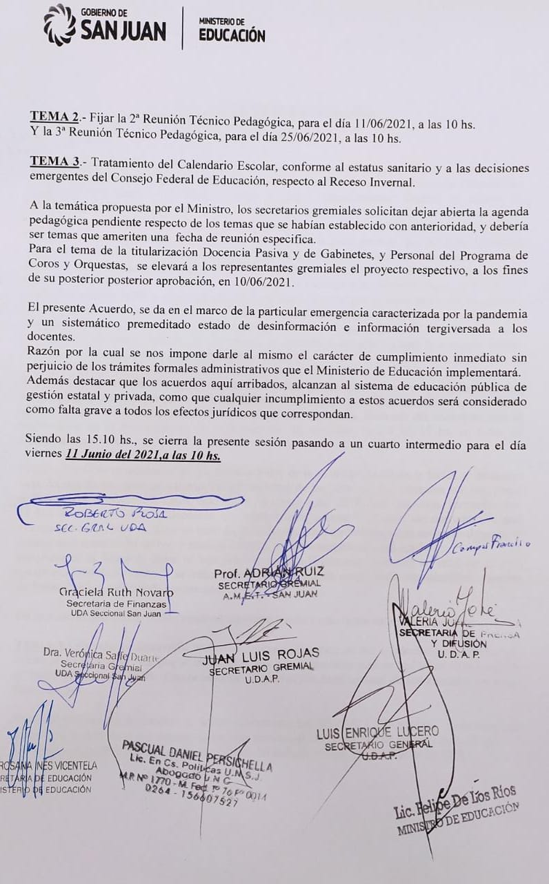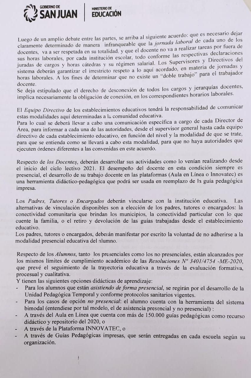 En el acuerdo se estableció que la jornada laboral de cada uno de los docentes será respetada en su totalidad; el docente no va a realizar tareas por fuera de sus horas laborales, conforme a la declaración jurada de cargos, horas cátedras y su régimen salarial. Los supervisores y directivos corroboraran lo acordado en materia de jornadas y horas laborales. Esto garantiza que no habrá un “doble trabajo” para el docente. Se deja estipulado el derecho de desconexión, la obligación de conexión es en los horarios laborales ya establecidos.