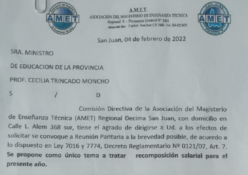 El sindicato AMET Regional X San Juan realizó el pedido formal al Ministerio de Educación para que se convoque a paritaria para discutir una recomposición salarial para el año 2022.