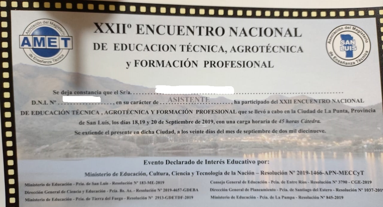 La Asociación del Magisterio de Enseñanza Técnico - AMET San Juan entrega los certificados del XXII Encuentro Nacional de Educación Técnica, Agrotécnica y Formación Profesional.