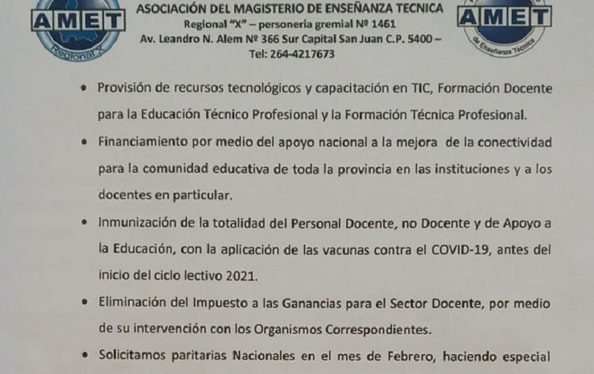 La Asociación del Magisterio de Enseñanza Técnica - AMET San Juan participó de la reunión en el Ministerio de Educación que se comenzó a definir el proceso de vacunación para docentes sanjuaninos.