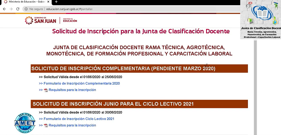 En un trabajo conjunto entre AMET y la Junta de Enseñanza Técnica, Agropecuaria, Monotécnica, Formación Profesional y Capacitación Laboral se continuará con la inscripción complementaria de marzo - abril del Ciclo 2020 que se interrumpió por el decreto de aislamiento debido a la pandemia COVID-19. Además se da inicio a la inscripción anual de junio para la valoración del Ciclo Lectivo 2021.
