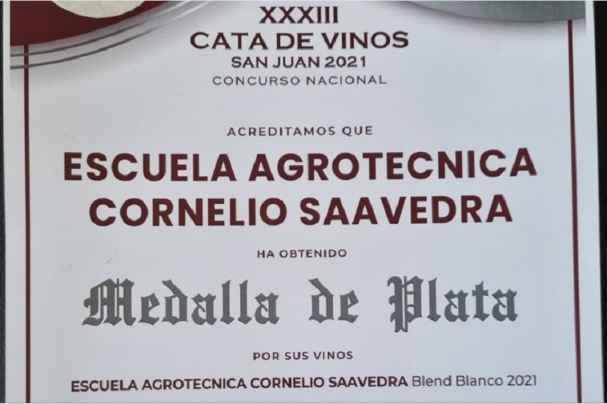 A través de las Prácticas Profesionalizantes, los estudiantes de 7º año de la Escuela Agrotécnica Cornelio Saavedra, con la supervisión del enólogo Nicolás Arguello y el profesor Cristian Esquivel, elaboraron un vino cuya calidad fue valorada en alta calificación vínica, siendo premiado con medalla de plata en la XXXIII Cata de Vinos San Juan 2021 Concurso Nacional.